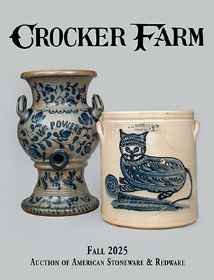 Our Fall 2025 Auction of American Stoneware & Redware, held online beginning Wednesday, November 5, features numerous examples of museum-quality ceramics from the Northern, Southern, Mid-Atlantic, and Midwestern U.S. This catalog, as usual, presents hundreds of lots in full color with detailed descriptions and condition reports. Our catalogs make great references on antique American pottery. Now shipping!